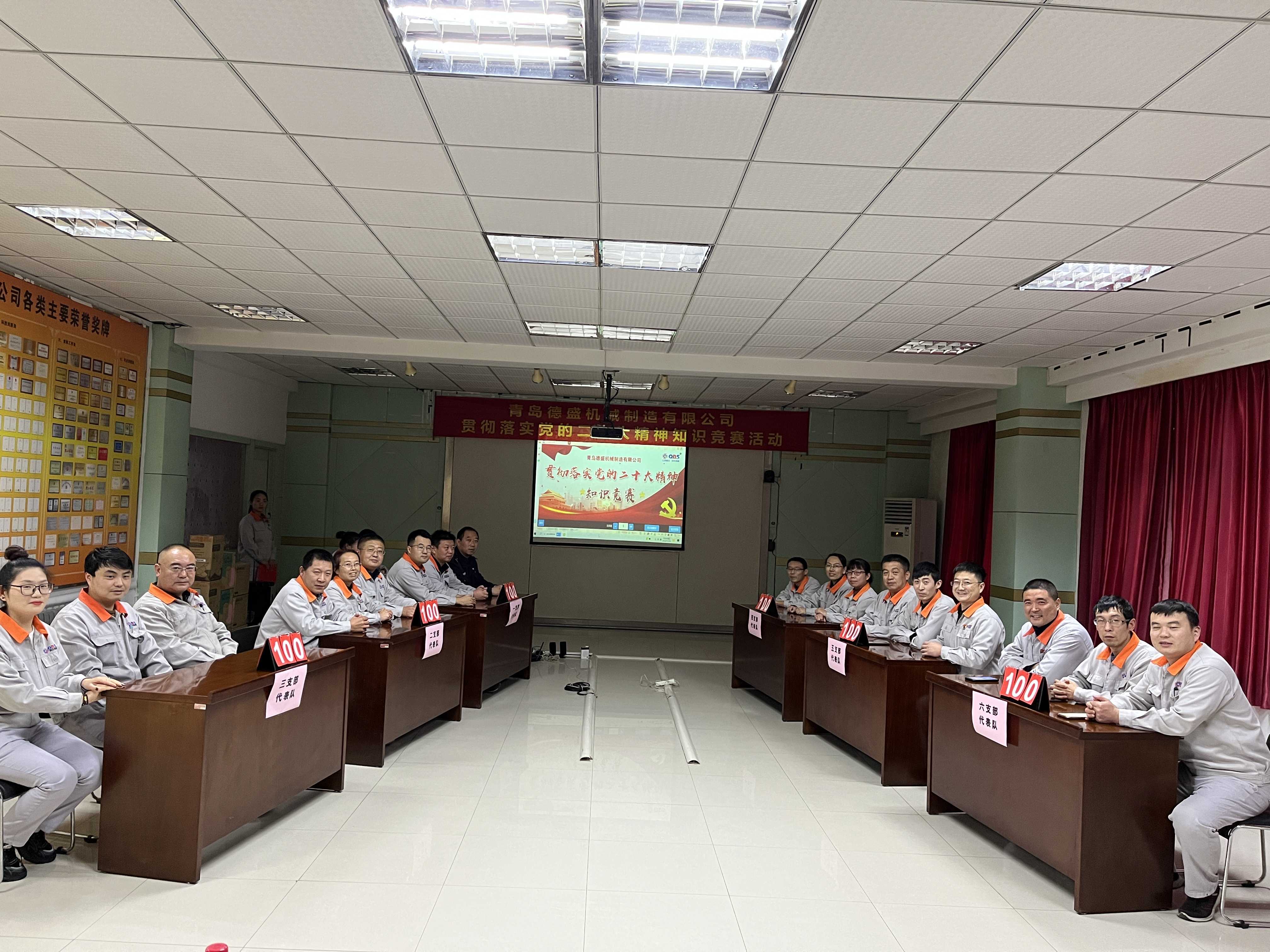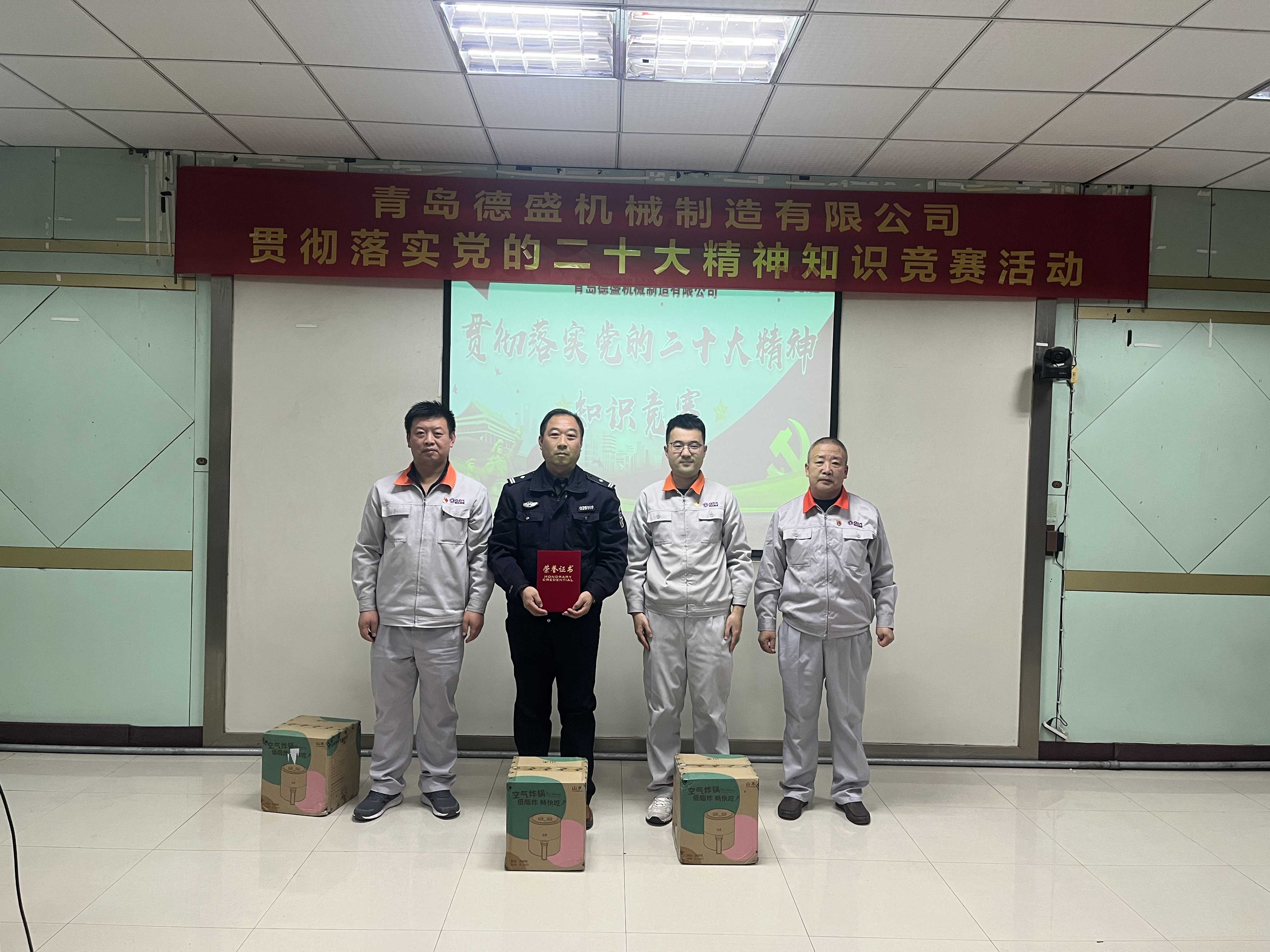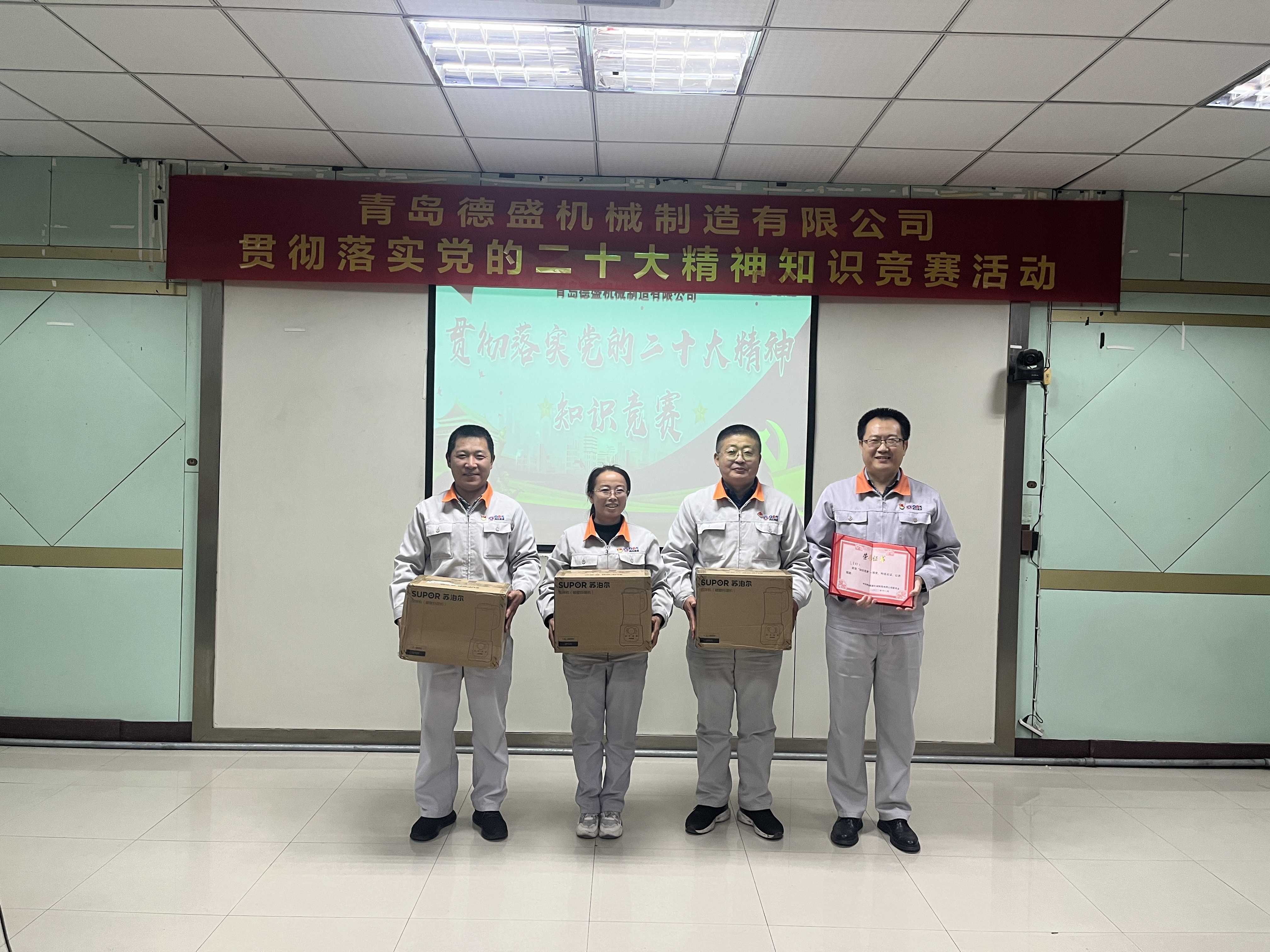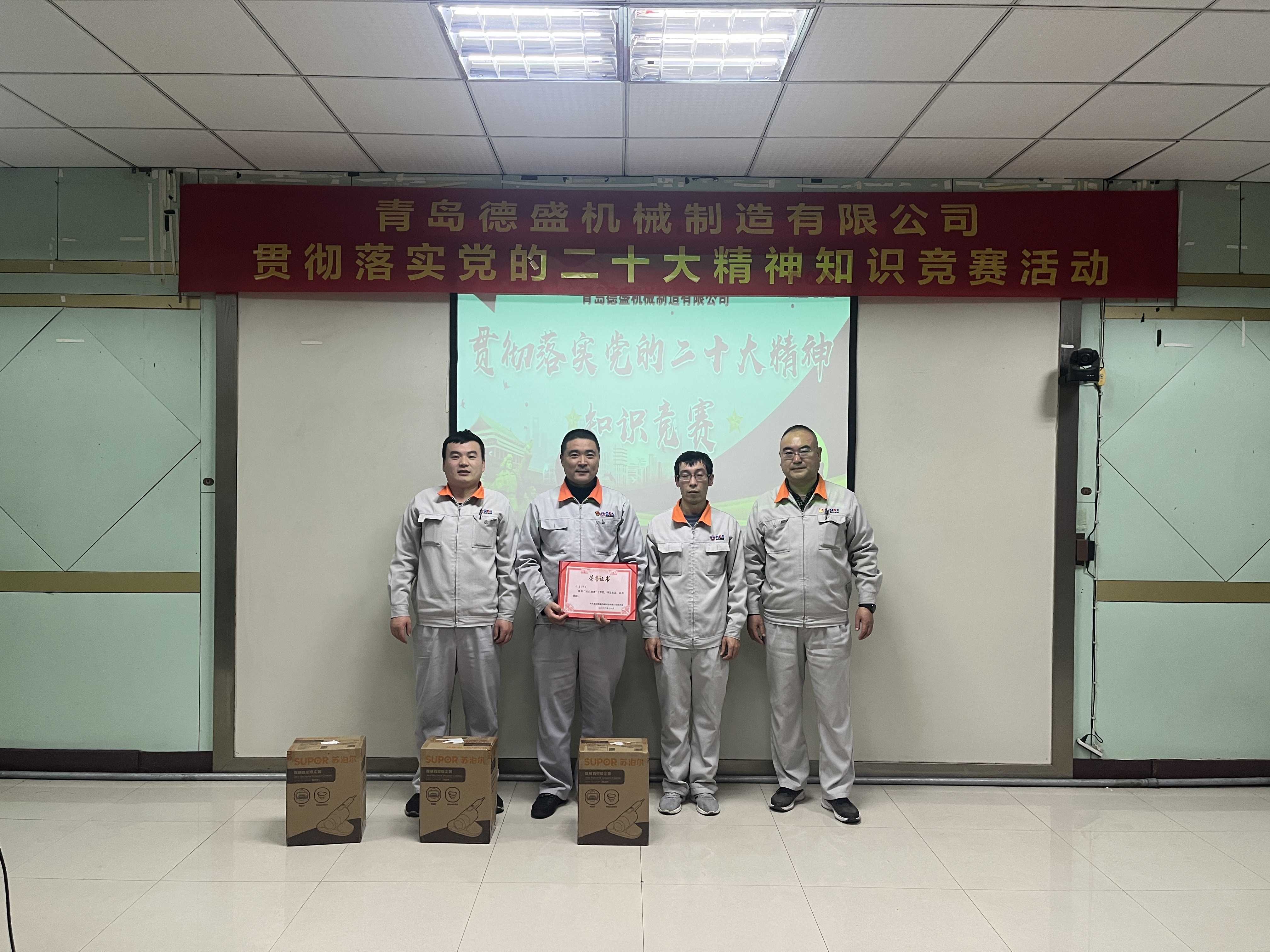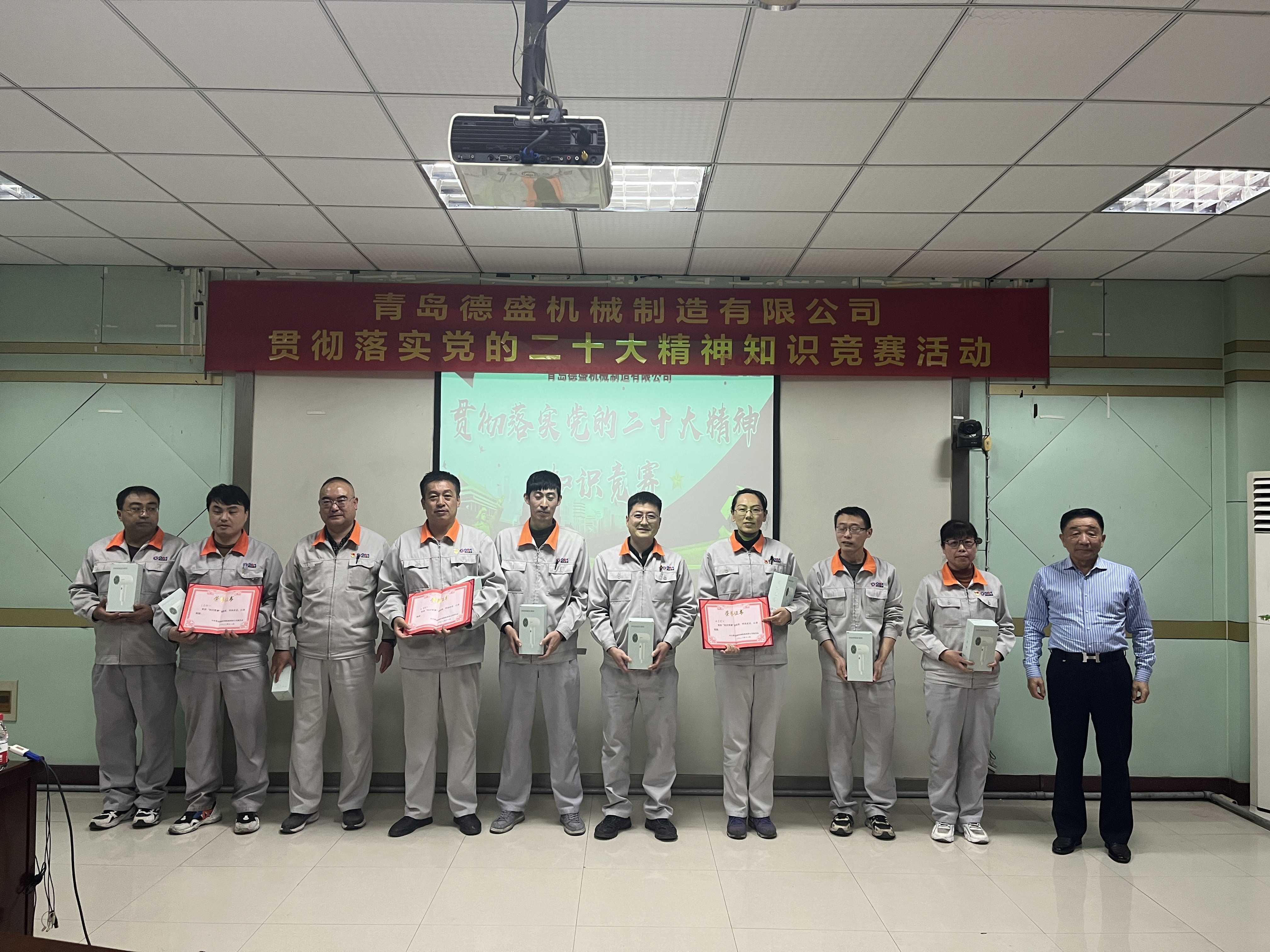 為熱烈慶祝黨的二十大勝利召開,深入貫徹落實(shí)黨的二十大精神,進(jìn)一步推進(jìn)公司黨員的思想、組織、作風(fēng)建設(shè),不斷提高理論學(xué)習(xí)水平,踔厲奮發(fā)、勇毅前行。11月18日下午,中共青島德盛機(jī)械制造有限公司黨委組織開展了“貫徹落實(shí)黨的二十大精神”知識(shí)競賽活動(dòng)。公司董事長孫佩璋,黨委書記、營銷和經(jīng)濟(jì)運(yùn)行總監(jiān)羅賽,黨委副書記、黨政管理總監(jiān)李建平,黨委委員、董事長辦公室主任、黨政辦公室主任李超,黨委委員、總經(jīng)理助理、生產(chǎn)管理部經(jīng)理張錫軍,黨委委員、總經(jīng)理助理、技術(shù)研發(fā)中心主任王濤遠(yuǎn)出席本次活動(dòng)。