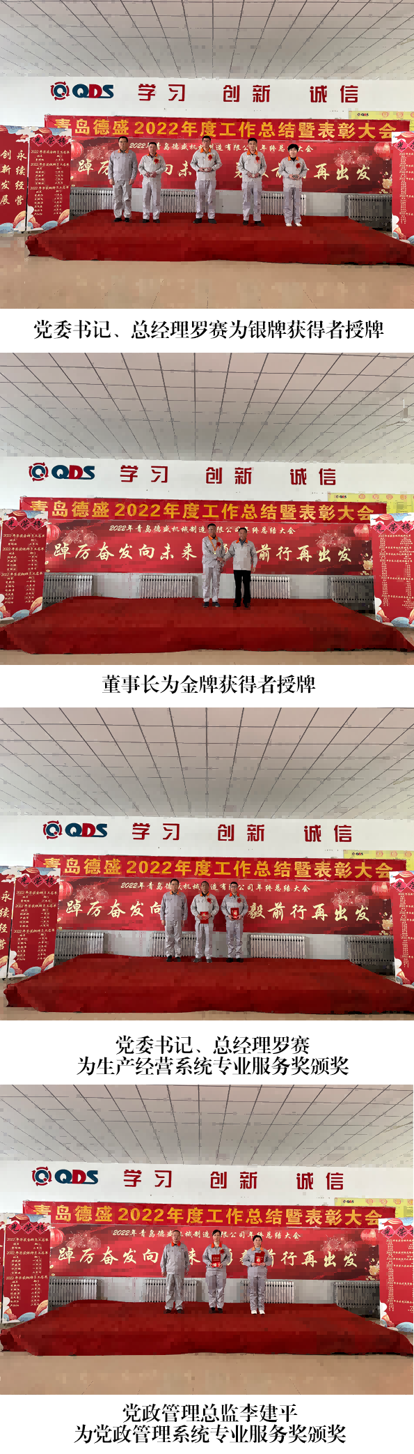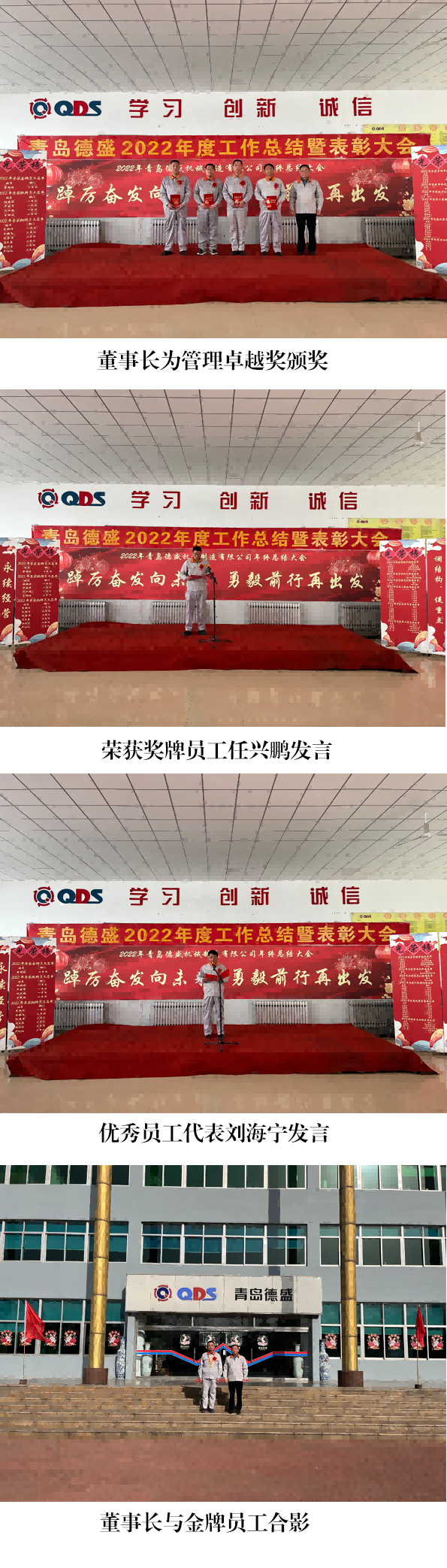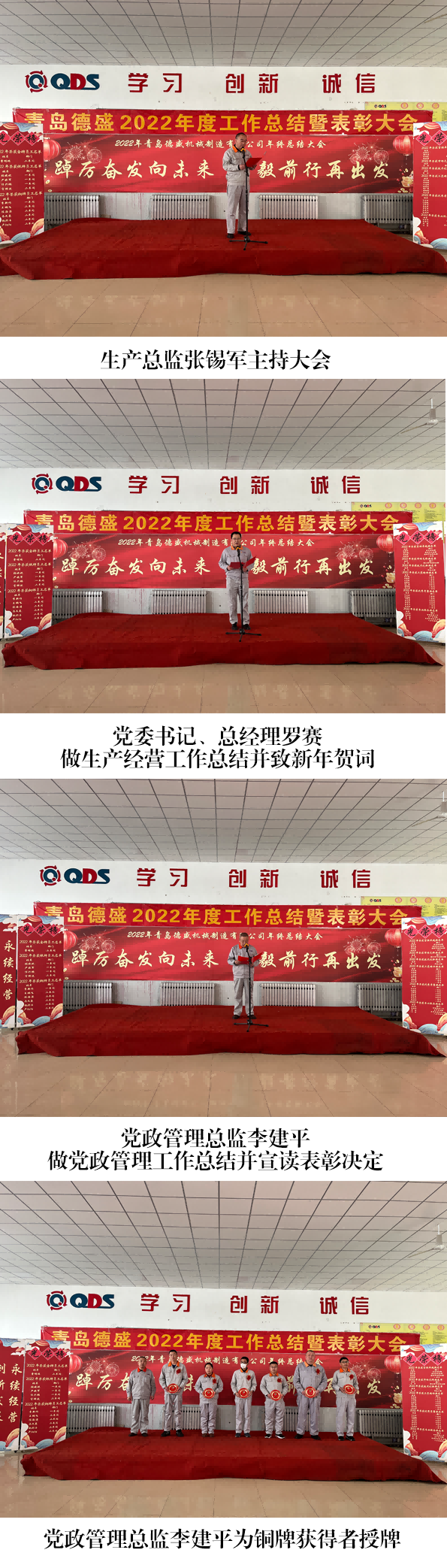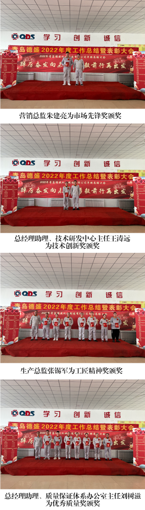 大會舉行了隆重的頒獎儀式,為劉書亮等4 名員工頒發(fā)“專業(yè)服 務(wù)獎”;為王杰頒發(fā)“市場先鋒獎”;為李文頒發(fā)“技術(shù)創(chuàng)新獎”;為 王佳麗等7 名員工頒發(fā)“工匠精神獎”;為任立剛等 7 名員工頒發(fā)“優(yōu) 秀質(zhì)量獎”;為劉海寧等4 名員工頒發(fā)“管理卓越獎”;為入職工作滿 10 年的李新作等6 名員工頒發(fā)銅牌;為入職工作滿 20 年的任興鵬等 4 名員工頒發(fā)銀牌;為入職工作滿30 年的曹明睿頒發(fā)金牌。榮獲獎 牌代表任興鵬、優(yōu)秀員工代表劉海寧分別發(fā)言,他們感謝公司的培養(yǎng)、 領(lǐng)導(dǎo)的信任和同事們的支持,并表示2023 年一定立足本職崗位,將 董事長提出的“調(diào)結(jié)構(gòu)、促重點(diǎn)、穩(wěn)投入、占高端、聚焦發(fā)展”的工 作總基調(diào)與本職工作相結(jié)合,不斷創(chuàng)新工作思路,努力提高工作能力 和工作水平,力求將各項(xiàng)工作做得更加扎實(shí)、更加到位,為公司的發(fā) 展做出新的貢獻(xiàn)!
